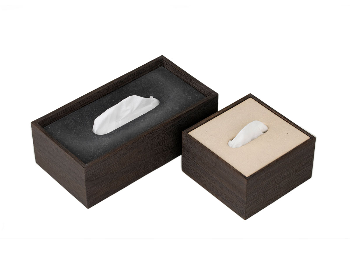 カバー を信楽の陶板と焼桐の合わせているので、和洋どちらの空間をも選ばず調和いたします。小は普通サイズ のティッシュを二つ折りにしたサイズです。底板 をスライドし て開き、2 つ折りにしたティッシュ 挿入セットしてご利用いただけます。